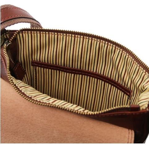 - Outside part: Back compartment with YKK metal zip, Front pocket with zip closure, Open pocket on the front side, Flap, Semi-rigid structure