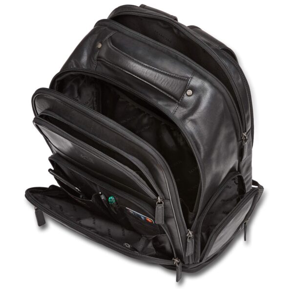 This backpack features a large main compartment as well as a zippered padded compartment to keep your laptop secure and protected. An organizer including an rfid secure pocket securely holds your personal belongings. A zippered side pocket, water bottle pocket as well as multiple front zippered pockets provide ample room for storage.
