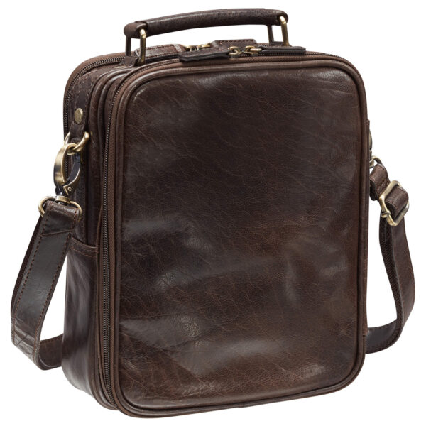 This large crossbody travel bag features a large main compartment and zippered rear organizer with multiple credit card slots, pen loops, etc. Includes a detachable shoulder strap.