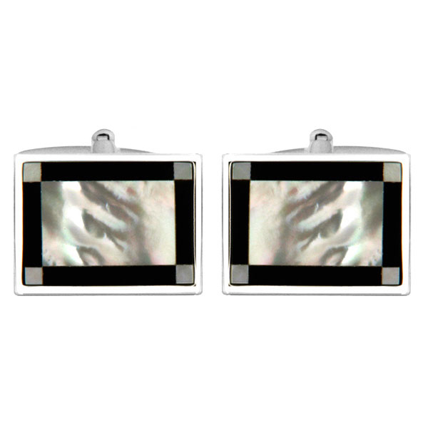 Rectangular Mother of Pearl & Onyx Edge Band Rhodium Plated Cufflinks 90-1197