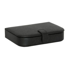Mele & Co. travel jewelry clutch in Hot Pink fabric. Sueded fabric closure flap with silver embroidered “love” and magnetic snap. Exterior body of clutch and interior of closure flap feature hot pink fabric with white polka dots. Interior of clutch has main central pocket, one shirred catch pocket, and one smaller pocket, plus silver foil stamped Mele & Co. logo. Hand lined in hot pink sueded fabric. Sturdy zip closure. 9 1/2″ x 1 1/2″ x 5″. Made in China.
