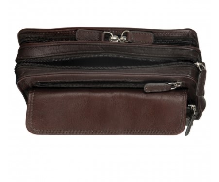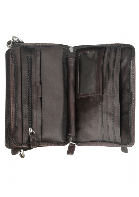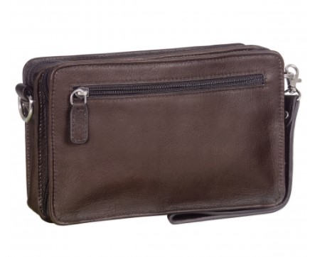 This deluxe unisex bag features zippered main compartment, a back organizer with multiple credit card slots and convenient zippered pockets on the front and back. The organizer is equipped with the latest RFID wave blocking technology to ensure your data and cards are safe. Includes detachable wrist and shoulder straps.